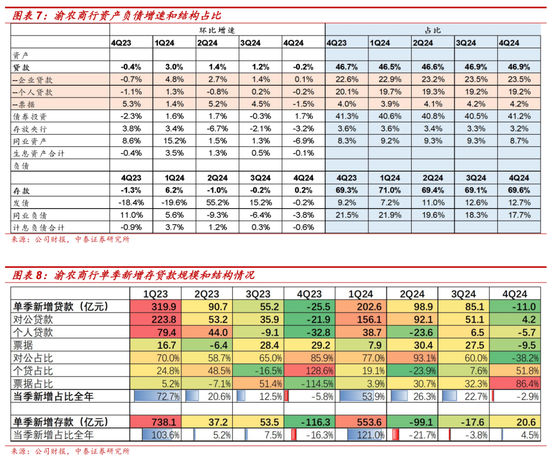 资产端:四季度信贷规模有所下降,票据压降较多。1、贷款:在投放总量上,渝农商行四季度单季投放规模为-11 亿,较 2023 年同期少减14.5 亿元。去年信贷投放仍然较为前置,一季度投放占全年的 54%,四季度预计以调结构为主,对公、个人和票据贷款分别投放 4.2/-5.7/-9.5亿元,票据压降较多。2、债券投资:债券投资规模环比提升 1.7%,占比环比提升 0.7 个百分点至 41.2%。3、存放央行和同业资产:存放央行资产和同业资产环比分别下降 3.2%和 6.9%,占比合计下降 0.7 个百分点至 11.9%。