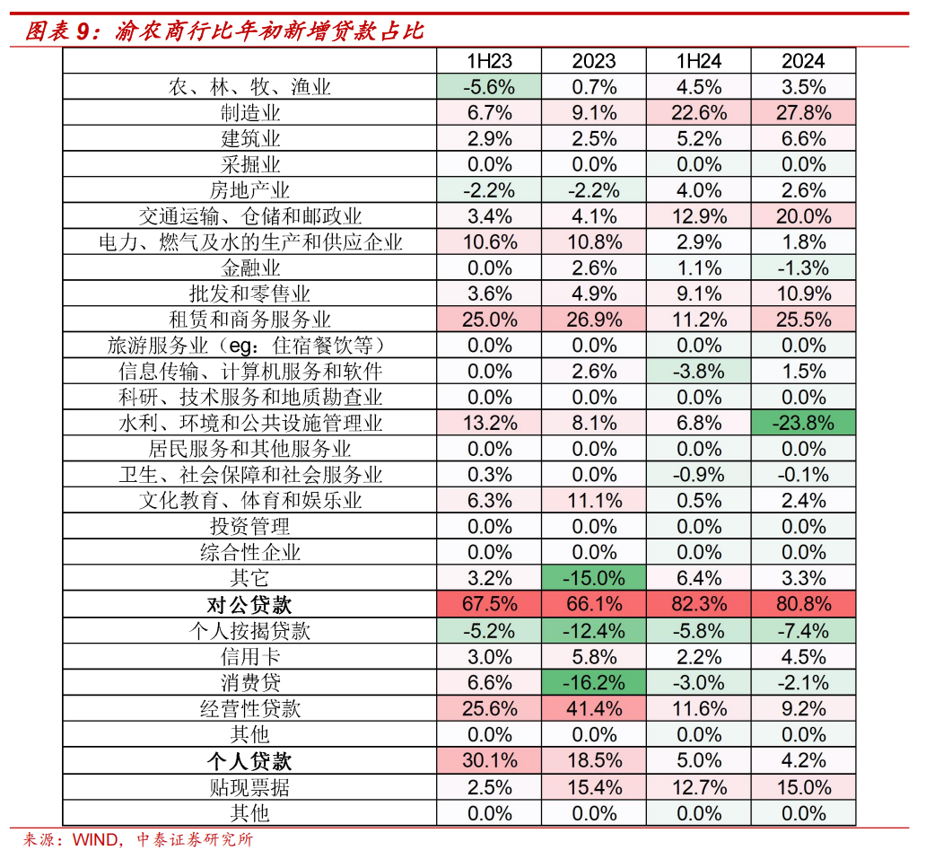 总体指标多维度看:1、不良维度——不良指标环比小幅上升。4Q24 渝农商行不良率 1.18%,环比上升 1bp。累计年化不良净生成率为 0.91%,环比小幅上升 5bp。未来不良压力方面,关注类贷款占比 1.46%,较半年度小幅上升 5bp。2、逾期维度——逾期率有所下降。4Q24 逾期率较上半年下降 20bp 至 1.32%,逾期占比不良也下降 15.8 个百分点至112.24%。3、拨备维度——拨备有所增厚。拨备覆盖率环比三季度提高4.84 个百分点至 363.43%;拨贷比环比上升 8bp 至 4.28%。