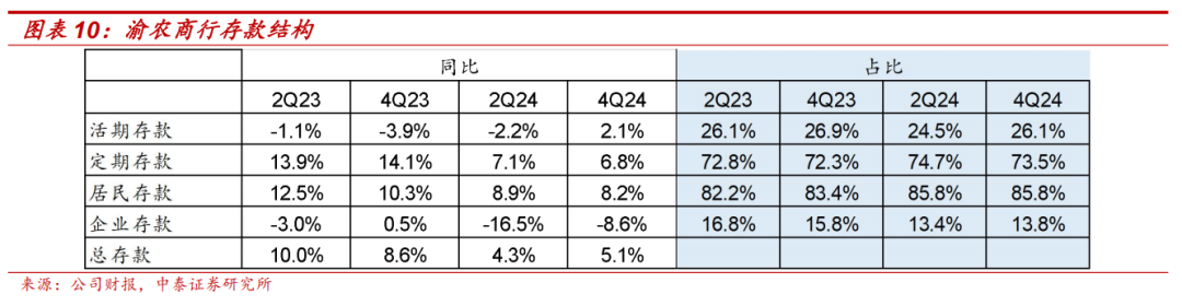 存款情况分析:1、从期限上看,存款定期化情况下半年有所缓解。4Q24活期存款增速由负转正至同比增长 2.1%,占总存款比例较上半年上升1.6 个百分点至 26.1%。2、从客户结构看,储蓄存款增长良好,居民存款保持 8.2%的增速,占比存款相较年初提升 2.4 个百分点至 85.8%。对公存款受手工补息整改等因素影响占比下降至 13.8%。