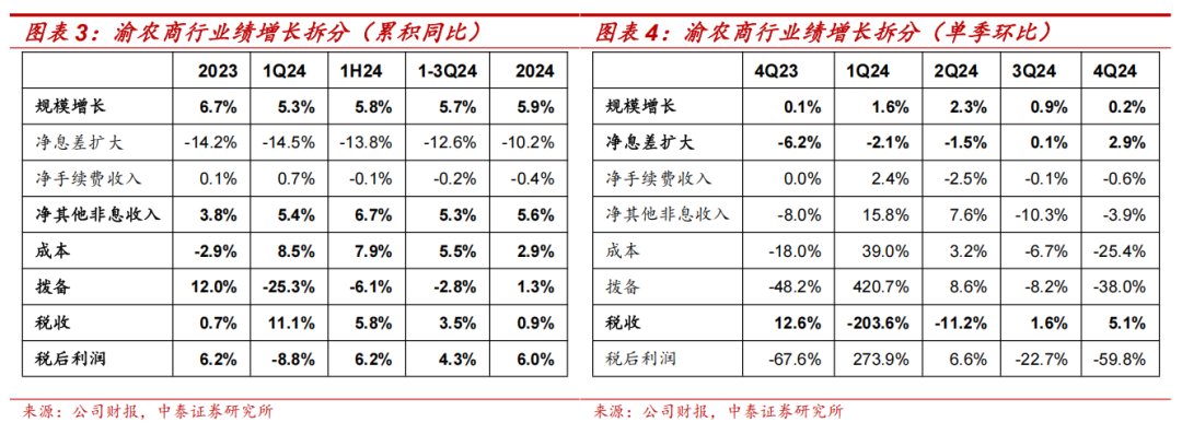 2024 年业绩同比增长拆分:正向贡献业绩因子为规模、其他非息、成本、拨备、税收。负向贡献因子为净息差、净手续费、成本。细看各因子贡献变化情况,边际对业绩贡献改善的是:1、四季度信贷规模有所收缩,不过在去年同期的低基数下对业绩的正向贡献提升了 0.2 个百分点。2、四季度净息差回升,对业绩的负向贡献缩小 2.4 个百分点。3、其他非息四季度增速继续提高,对业绩的贡献也提升了 0.3 个百分点。4、拨备计提对业绩贡献继续提高 4.1 个百分点。边际贡献减弱的是:1、净手续费四季度增速略微下降,对业绩的负向贡献扩大 0.2 个百分点。2、四季度成本收入比对业绩的贡献下降 2.6 个百分点。3、税收对业绩的贡献下降 2.6 个百分点。