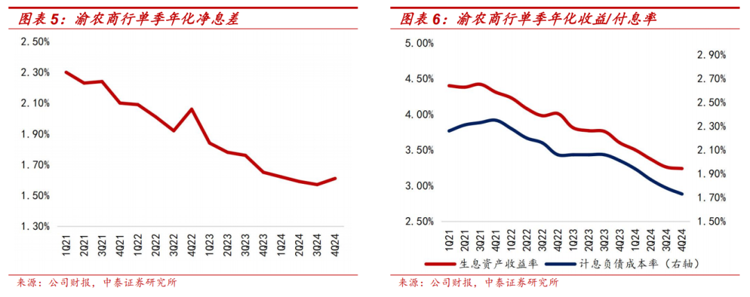 资产质量:整体保持稳定。1、不良维度——不良指标环比小幅上升。4Q24 渝农商行不良率 1.18%,环比上升 1bp。累计年化不良净生成率为 0.91%,环比小幅上升 5bp。未来不良压力方面,关注类贷款占比 1.46%,较半年度小幅上升 5bp。2、逾期维度——逾期率有所下降。4Q24 逾期率较上半年下降 20bp 至 1.32%,逾期占比不良也下降 15.8 个百分点至 112.24%。3、拨备维度——拨备有所增厚。拨备覆盖率环比三季度提高 4.84 个百分点至 363.43%;拨贷比环比上升 8bp 至4.28%。